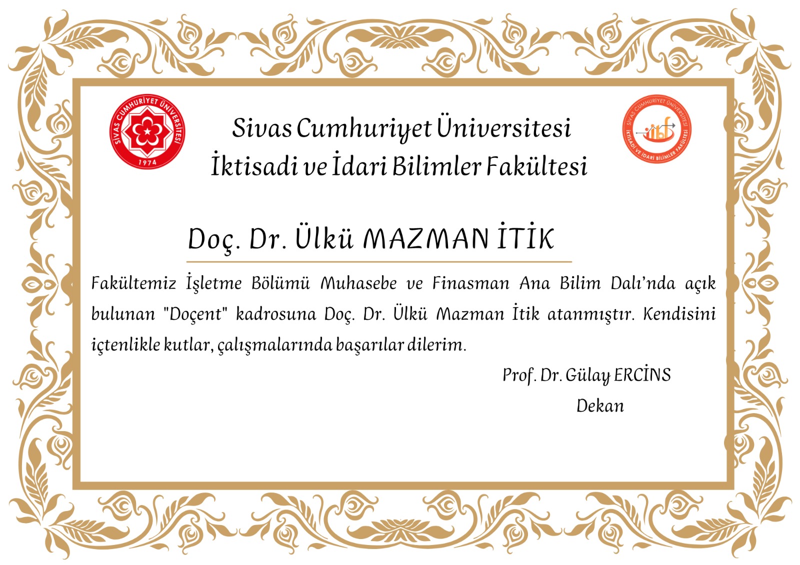 Fakültemiz İşletme Bölümü Muhasebe ve Finasman Ana Bilim Dalı’nda açık bulunan "Doçent" kadrosuna Doç. Dr. Ülkü Mazman İtik atanmıştır. Kendisini içtenlikle kutlar, çalışmalarında başarılar dileriz.