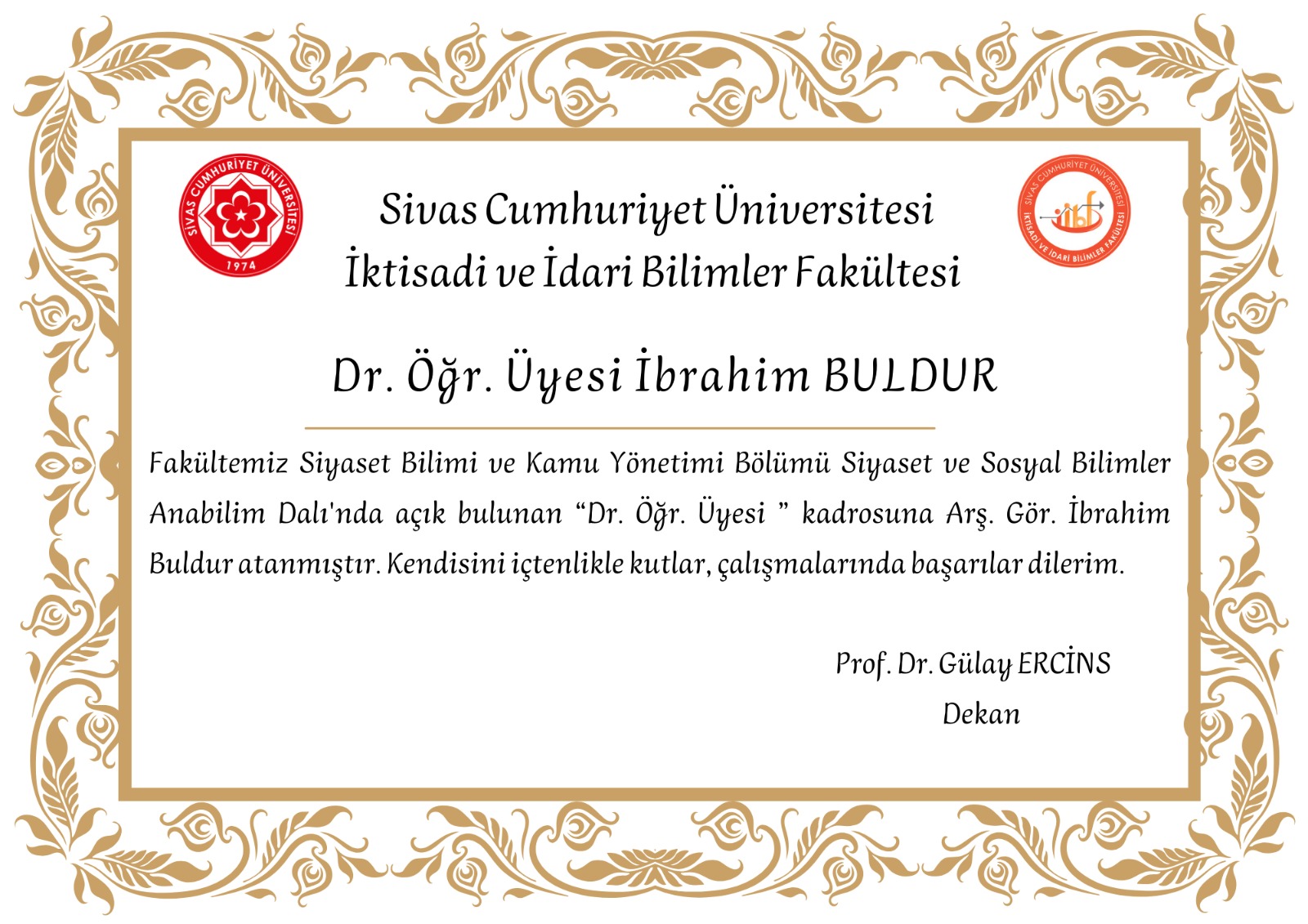 Fakültemiz Siyaset Bilimi ve Kamu Yönetimi Bölümü Siyaset ve Sosyal Bilimler Anabilim Dalı'nda açık bulunan “Dr. Öğr. Üyesi ” kadrosuna Arş. Gör. İbrahim Buldur atanmıştır. Kendisini içtenlikle kutlar, çalışmalarında başarılar dileriz.